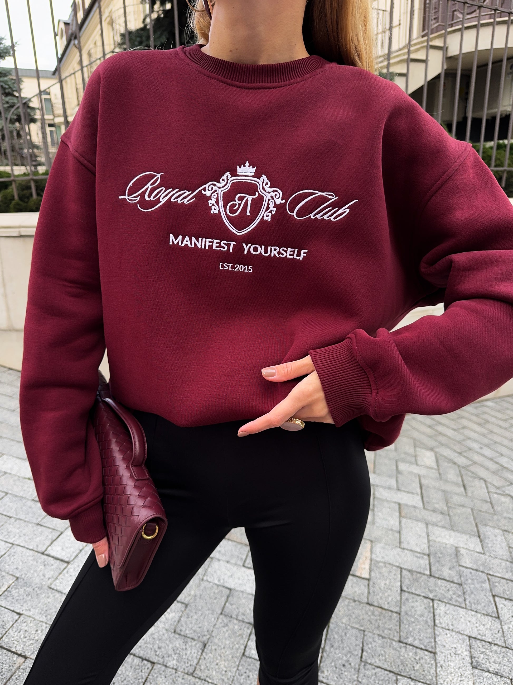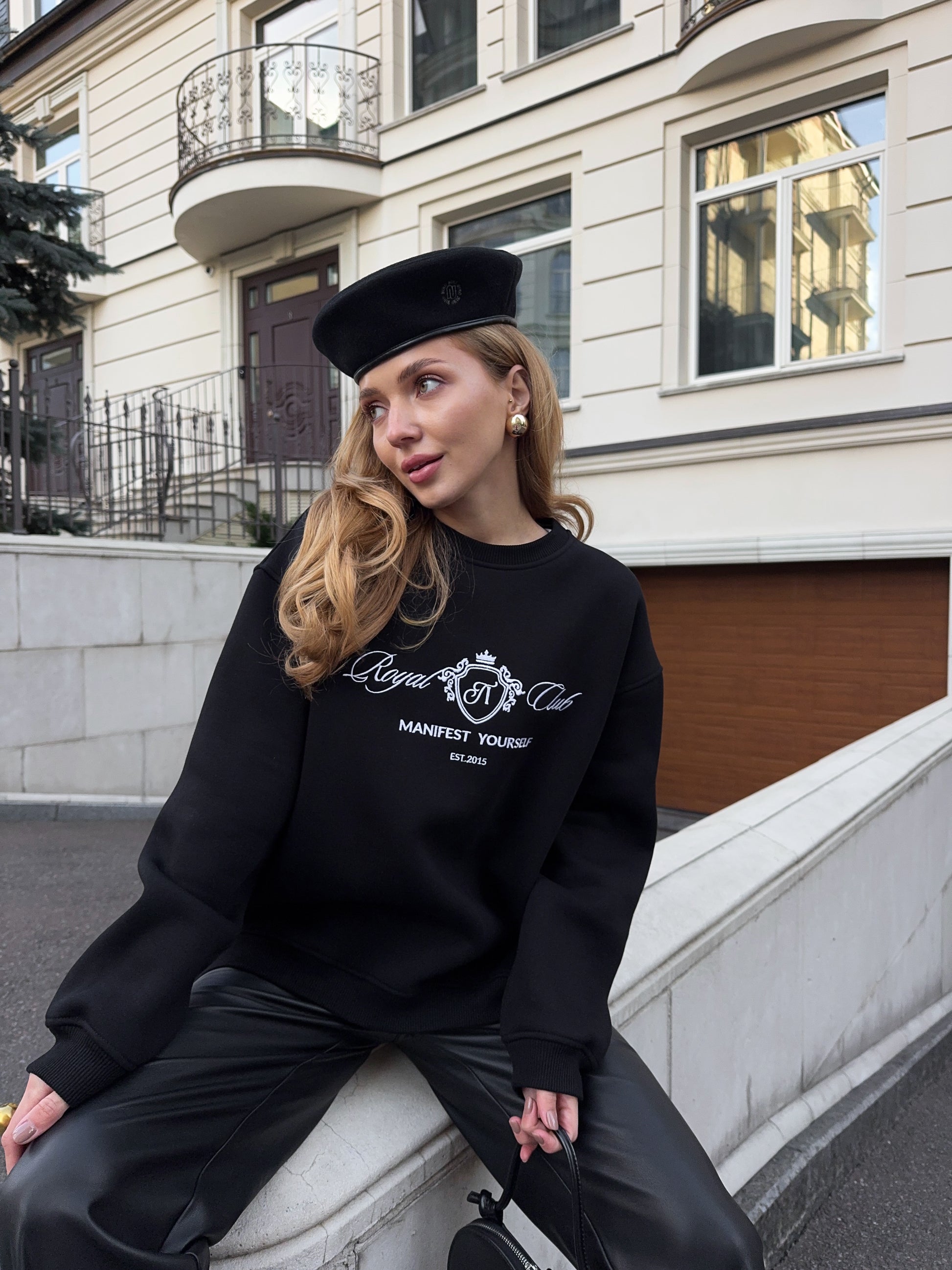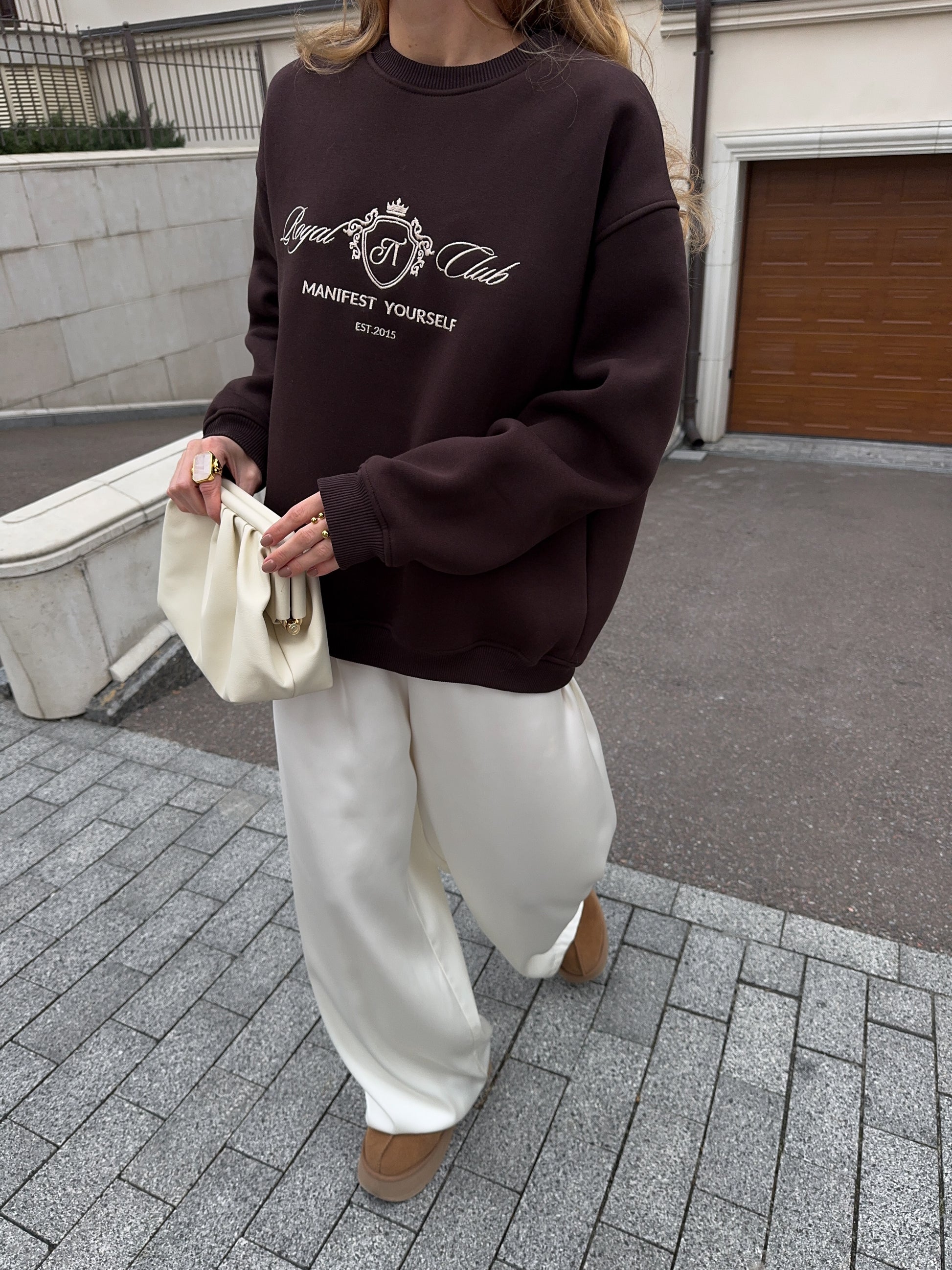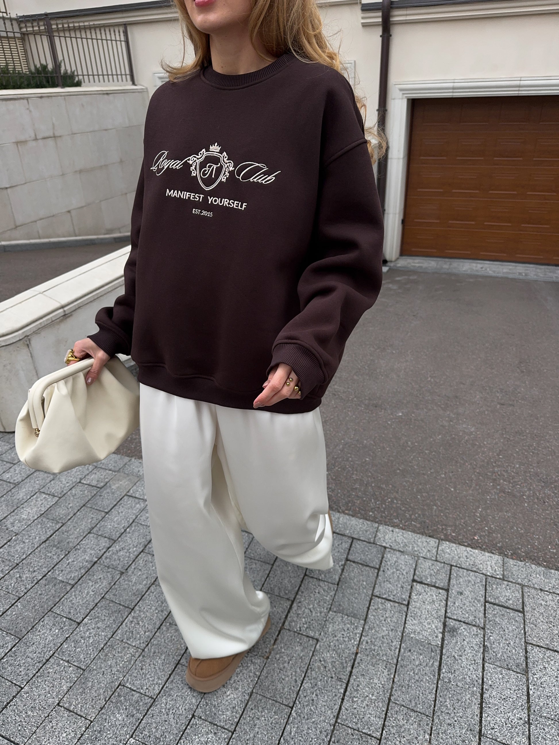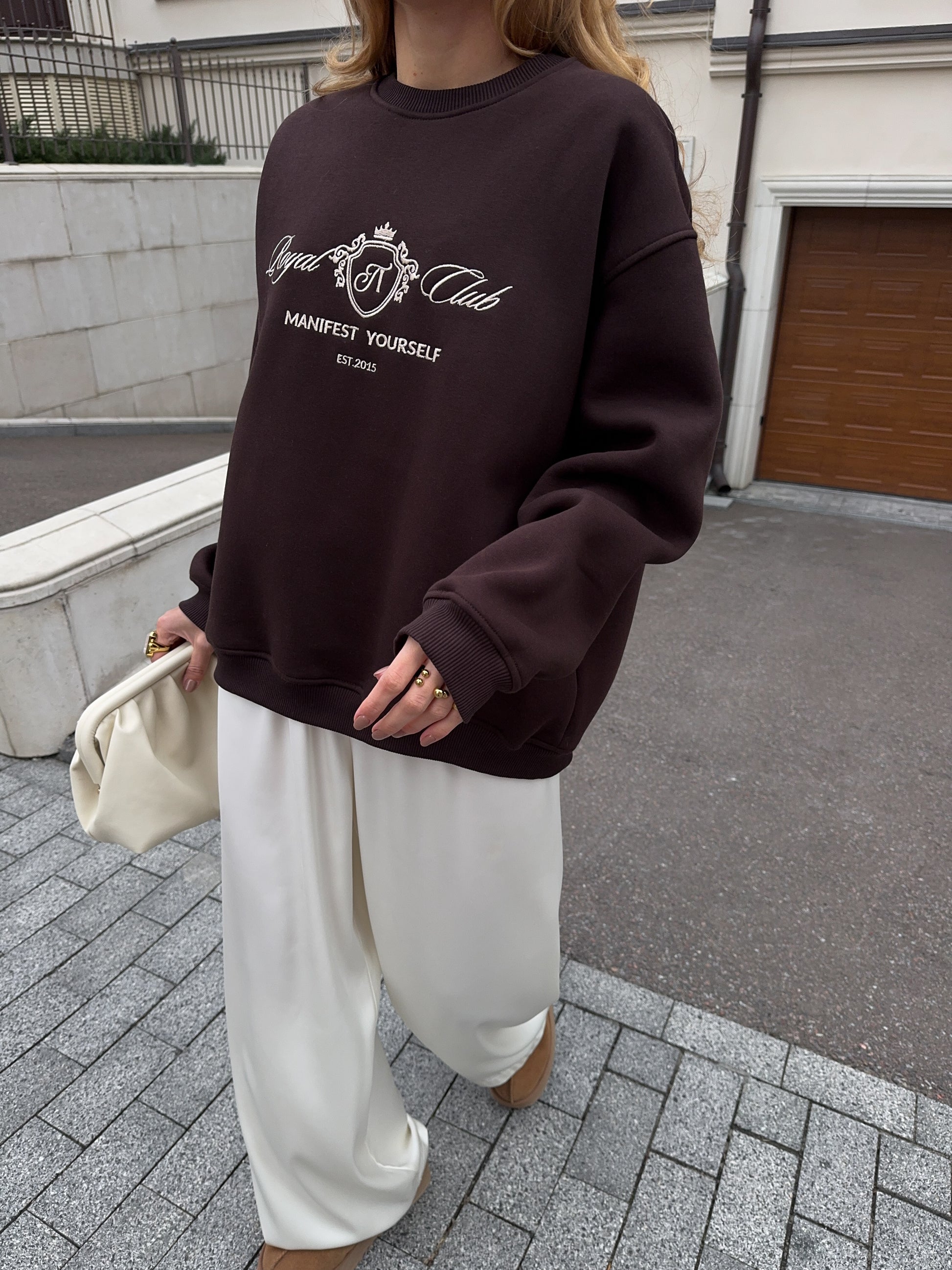 Стильний oversize світшот із обʼємною вишивкою Royal Club – Manifest Yourself створений для комфорту та елегантності у повсякденному стилі.