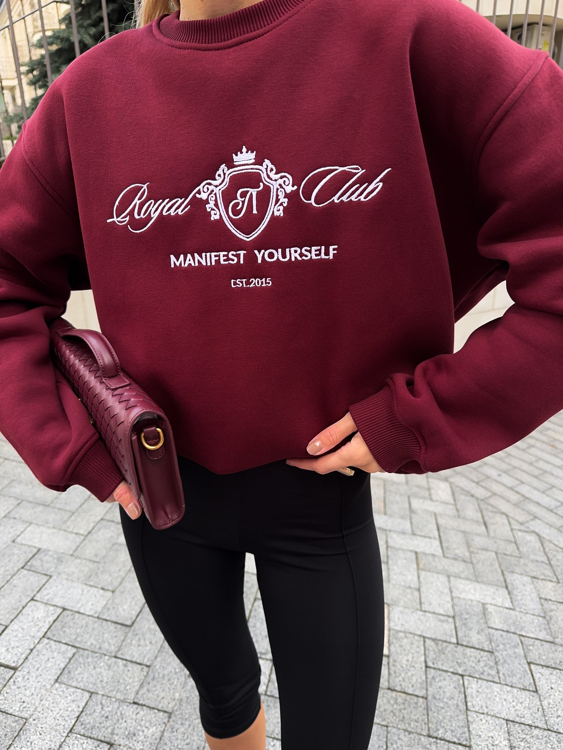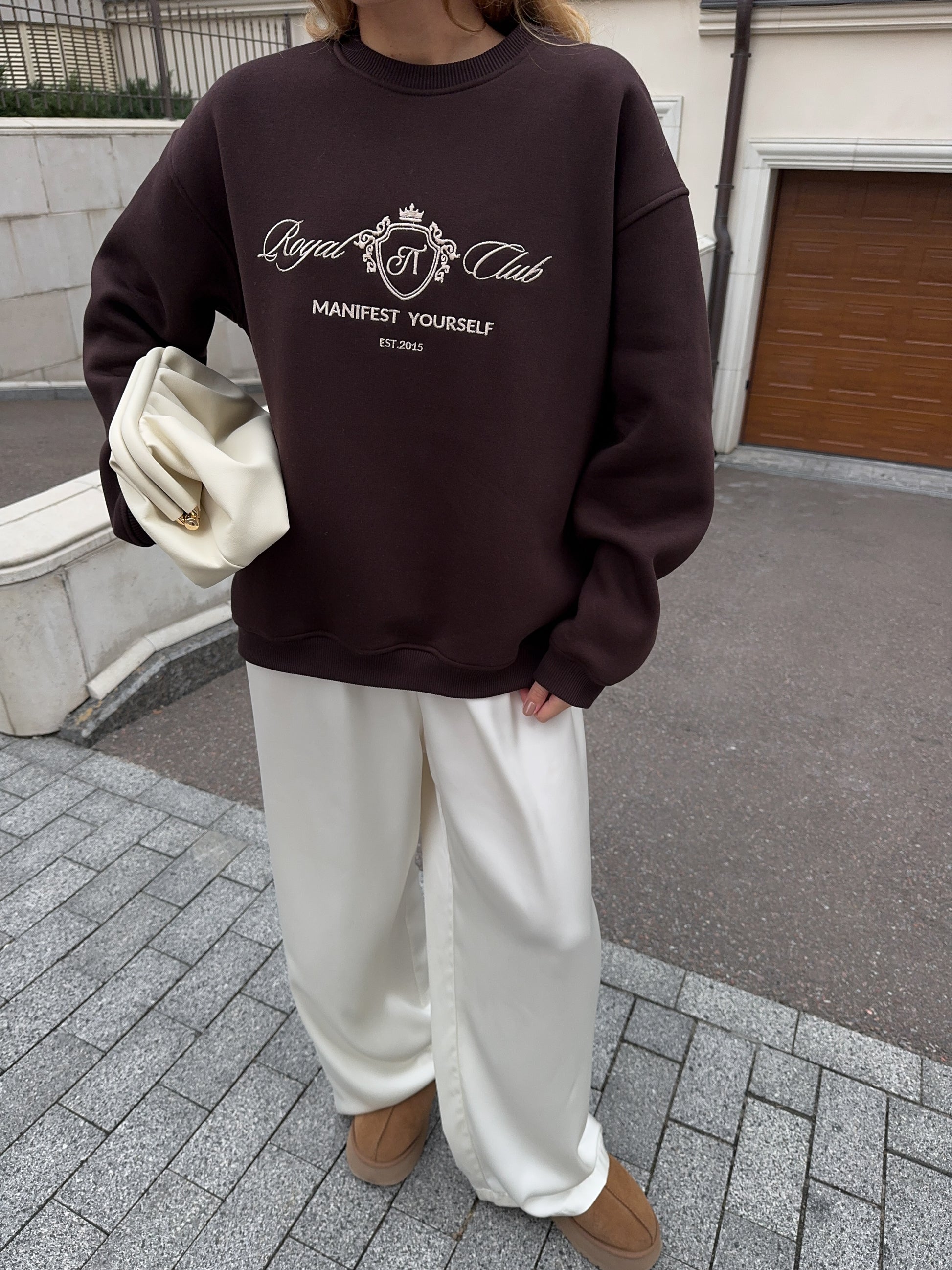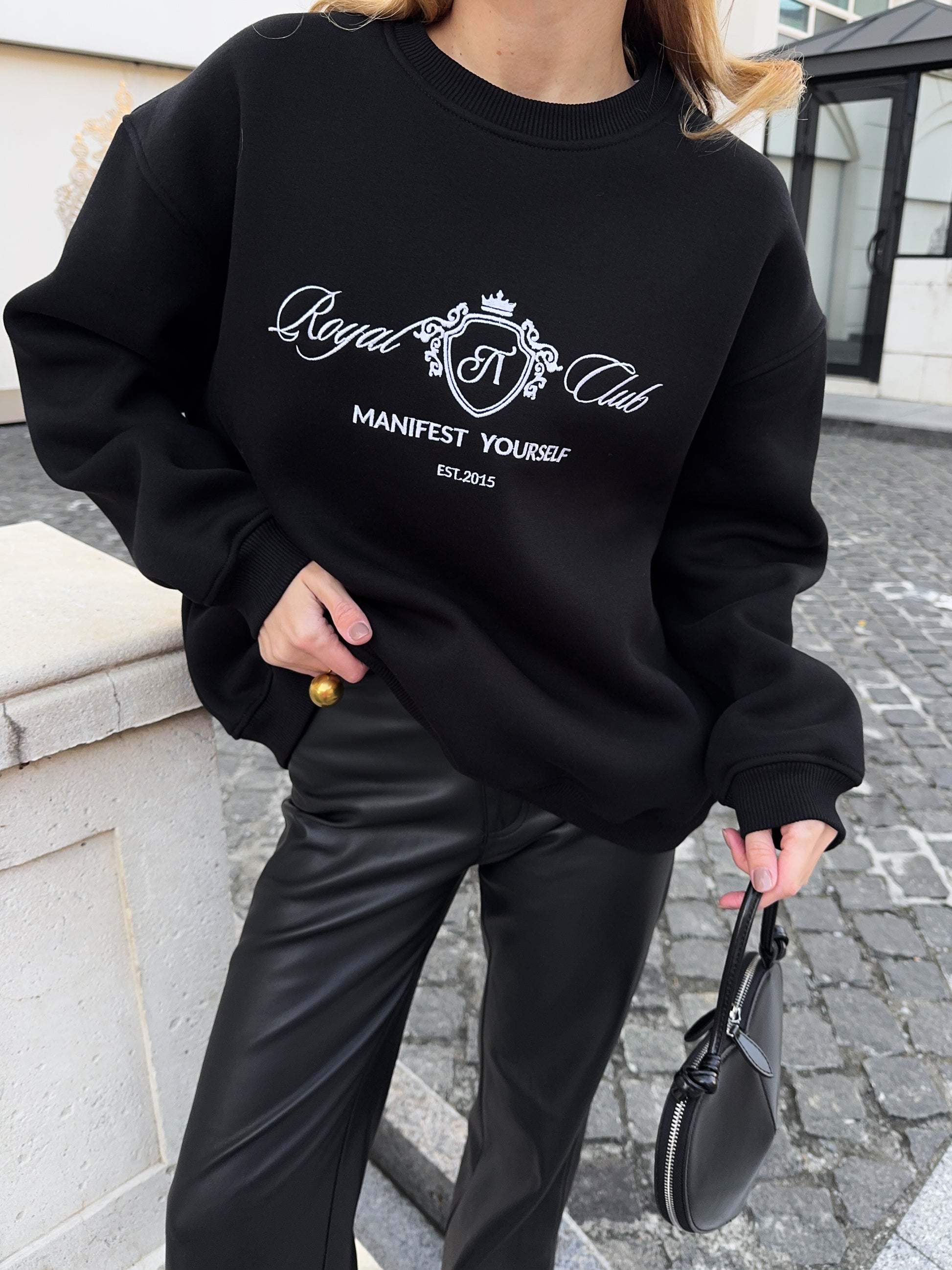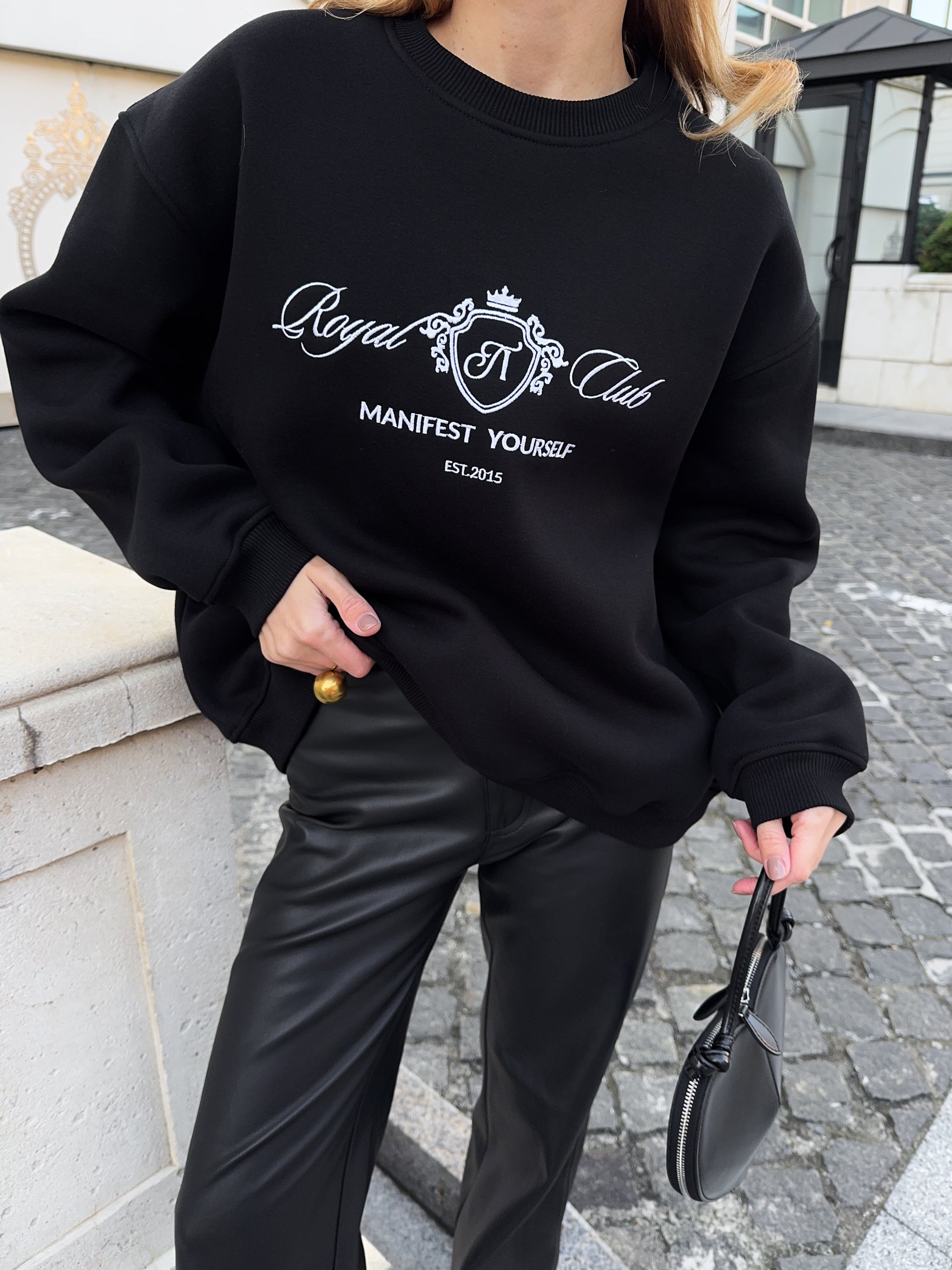Стильний oversize світшот із обʼємною вишивкою Royal Club – Manifest Yourself створений для комфорту та елегантності у повсякденному стилі.