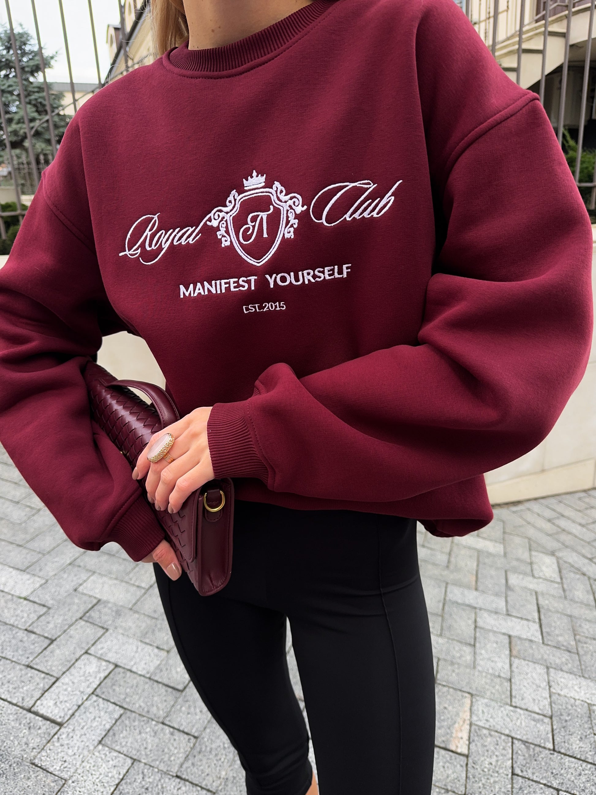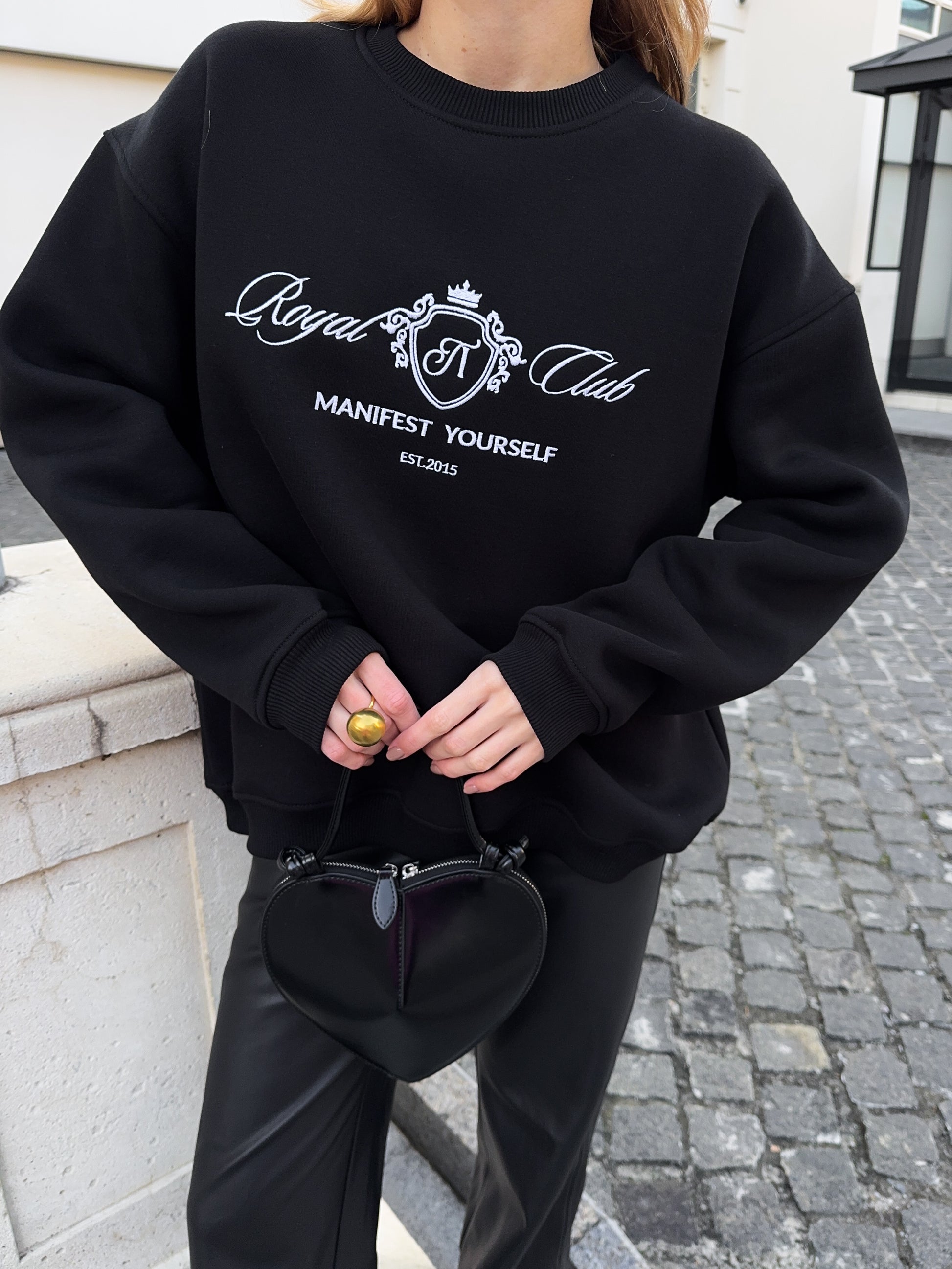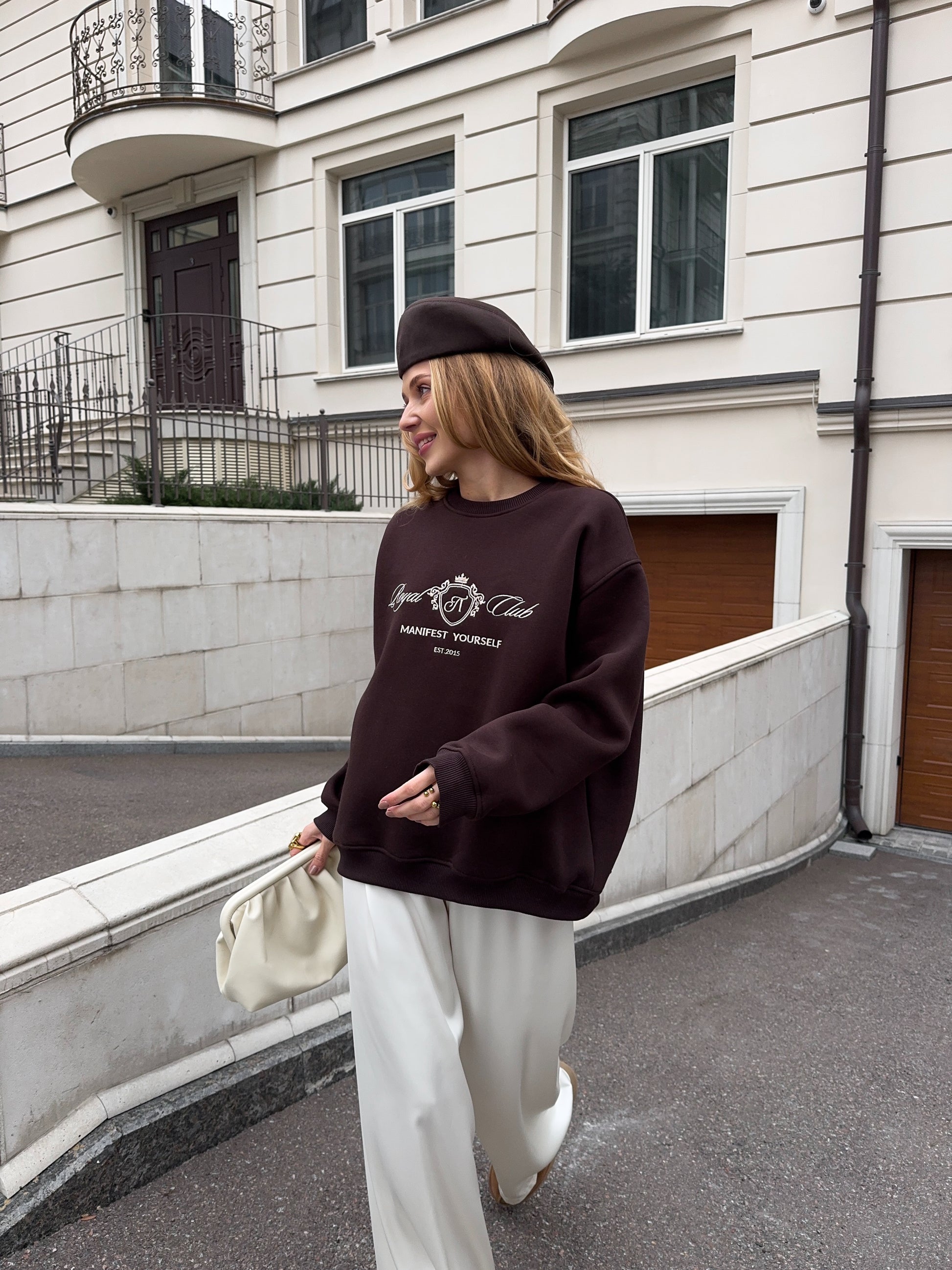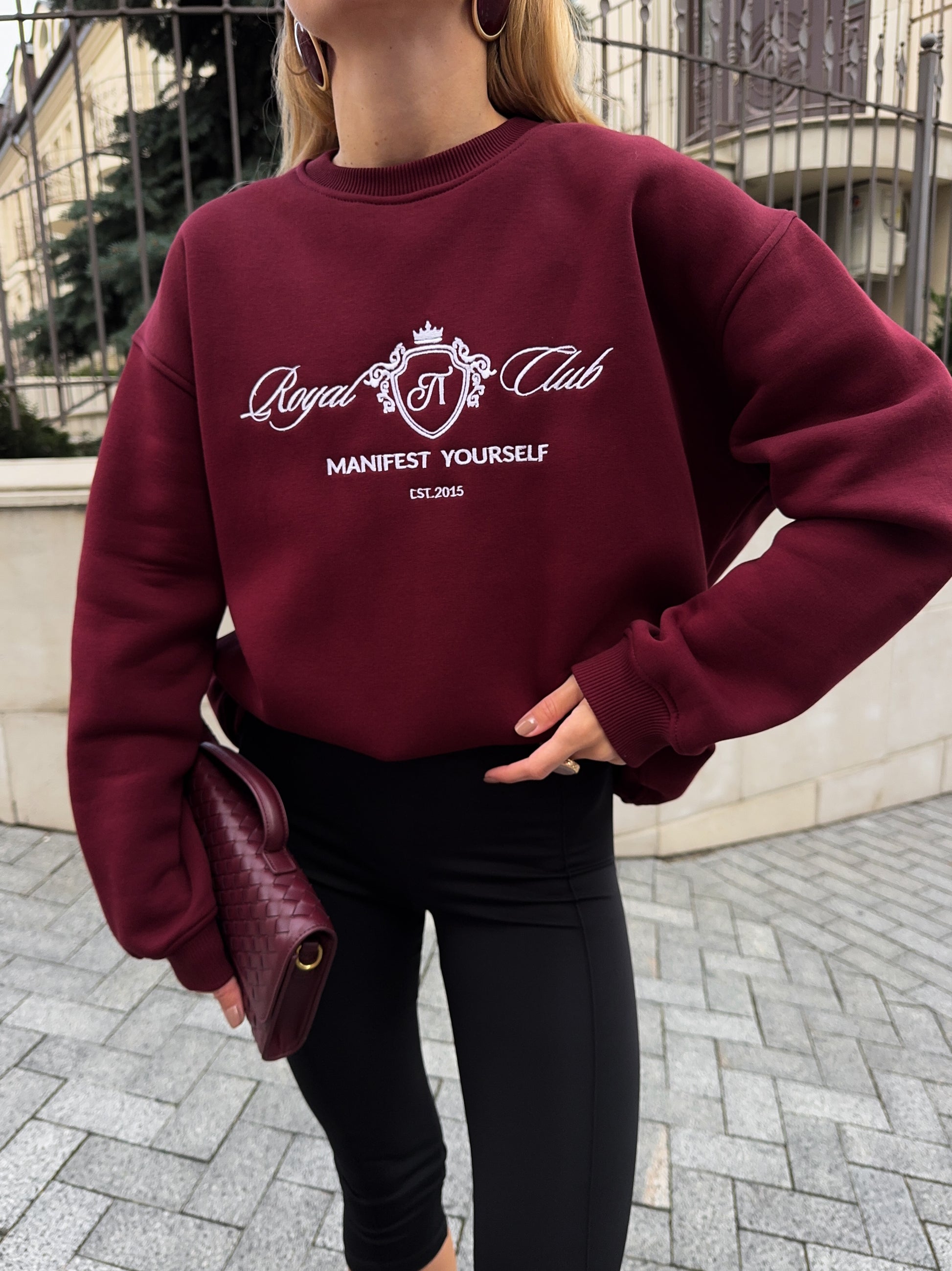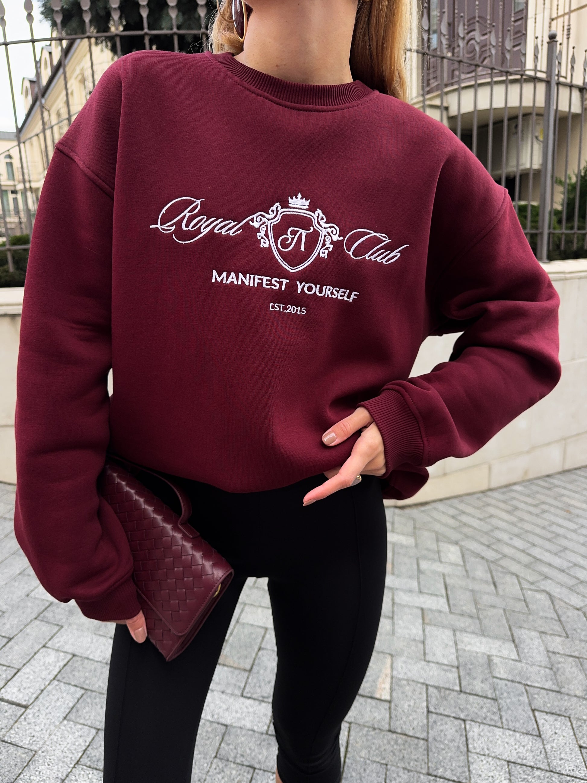 Стильний oversize світшот із обʼємною вишивкою Royal Club – Manifest Yourself створений для комфорту та елегантності у повсякденному стилі.
