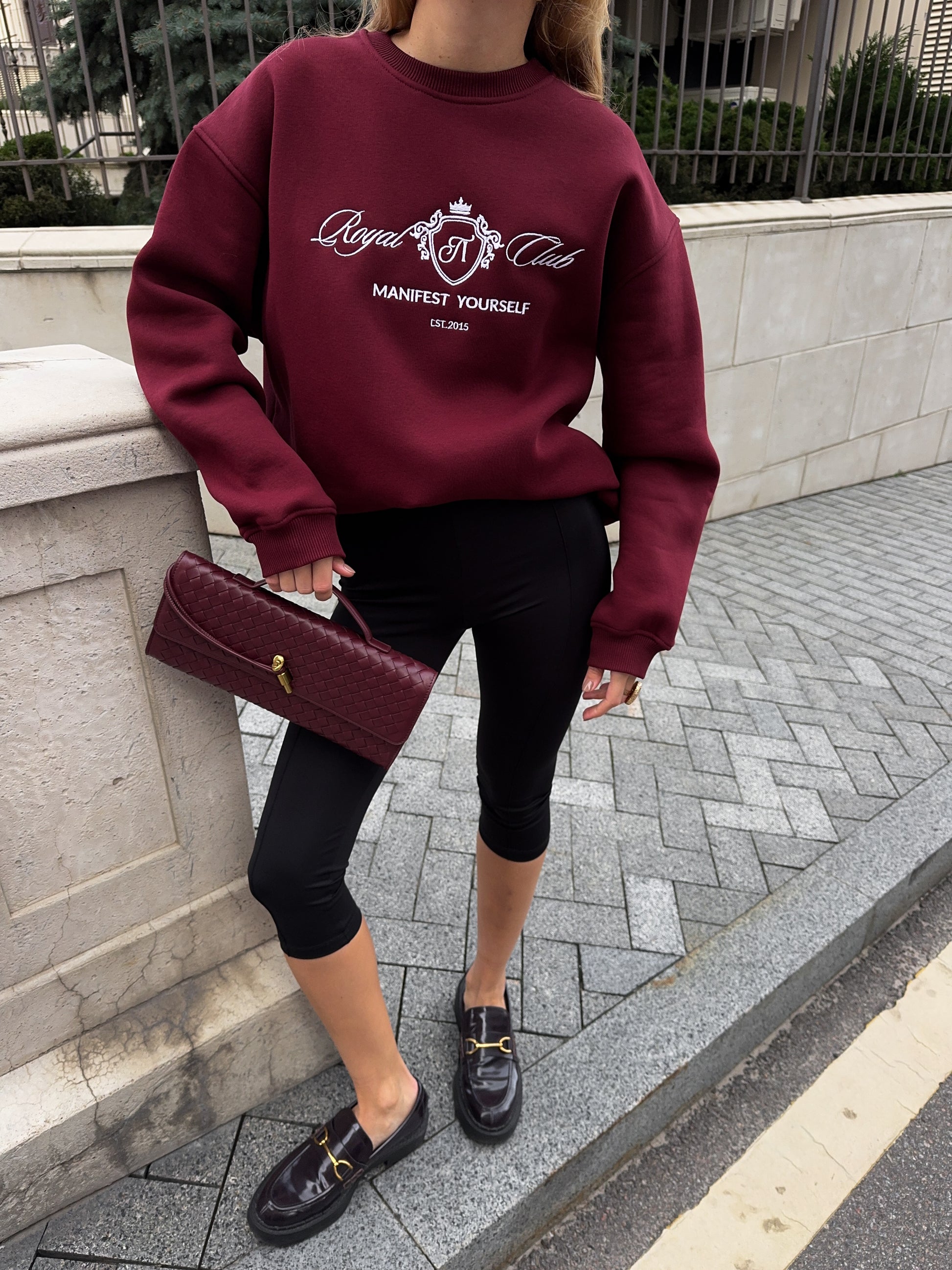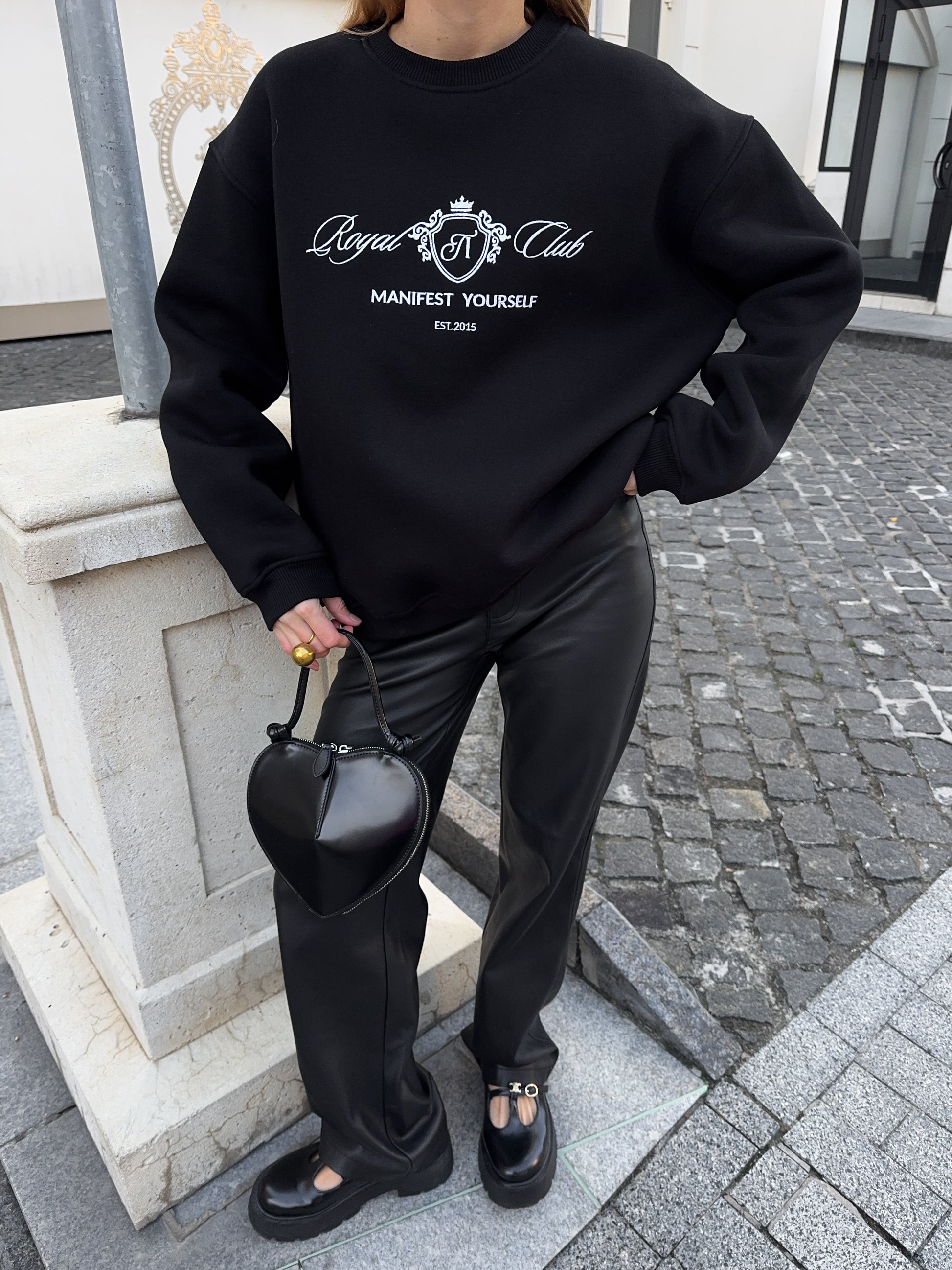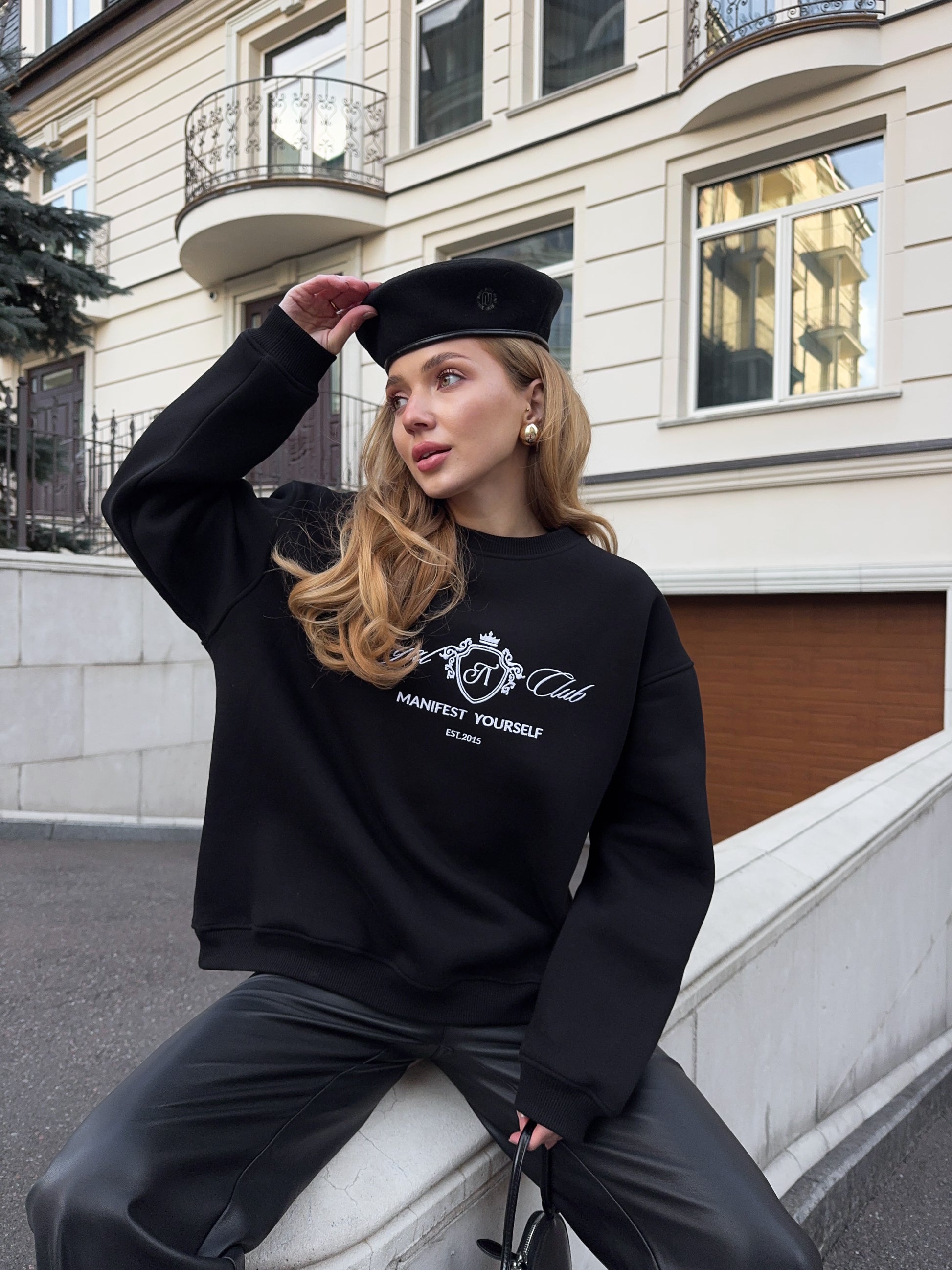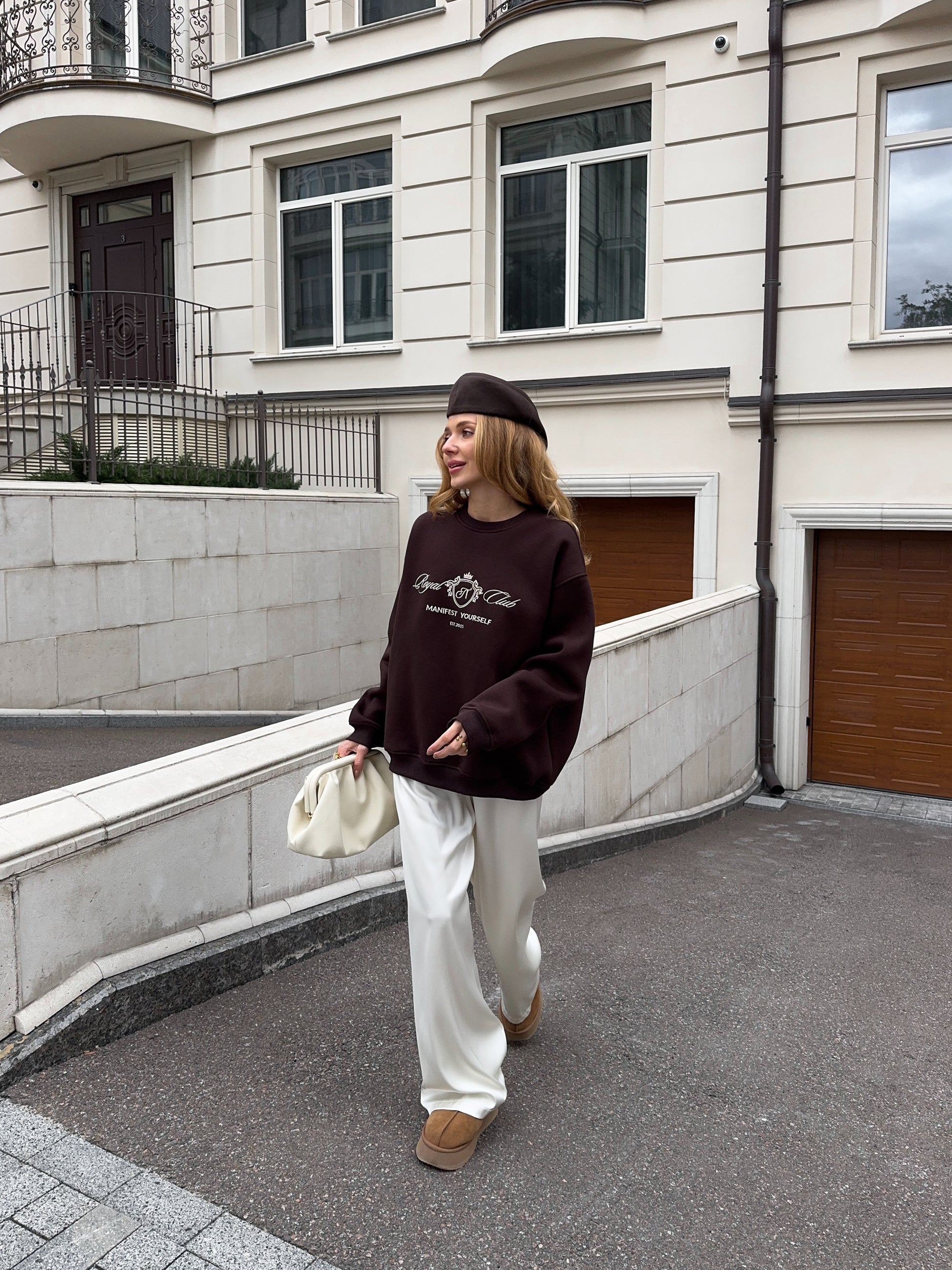 Стильний oversize світшот із обʼємною вишивкою Royal Club – Manifest Yourself створений для комфорту та елегантності у повсякденному стилі.