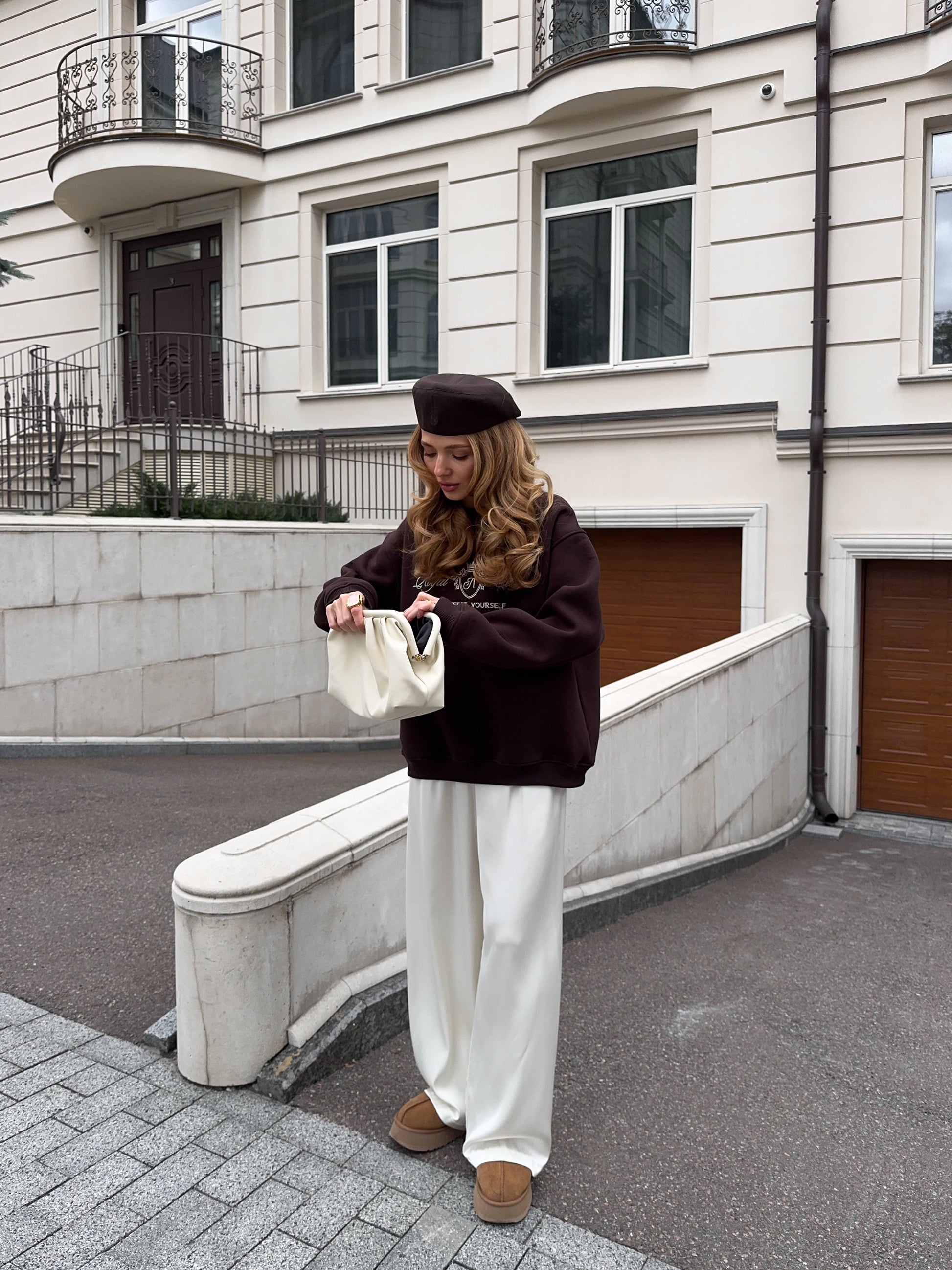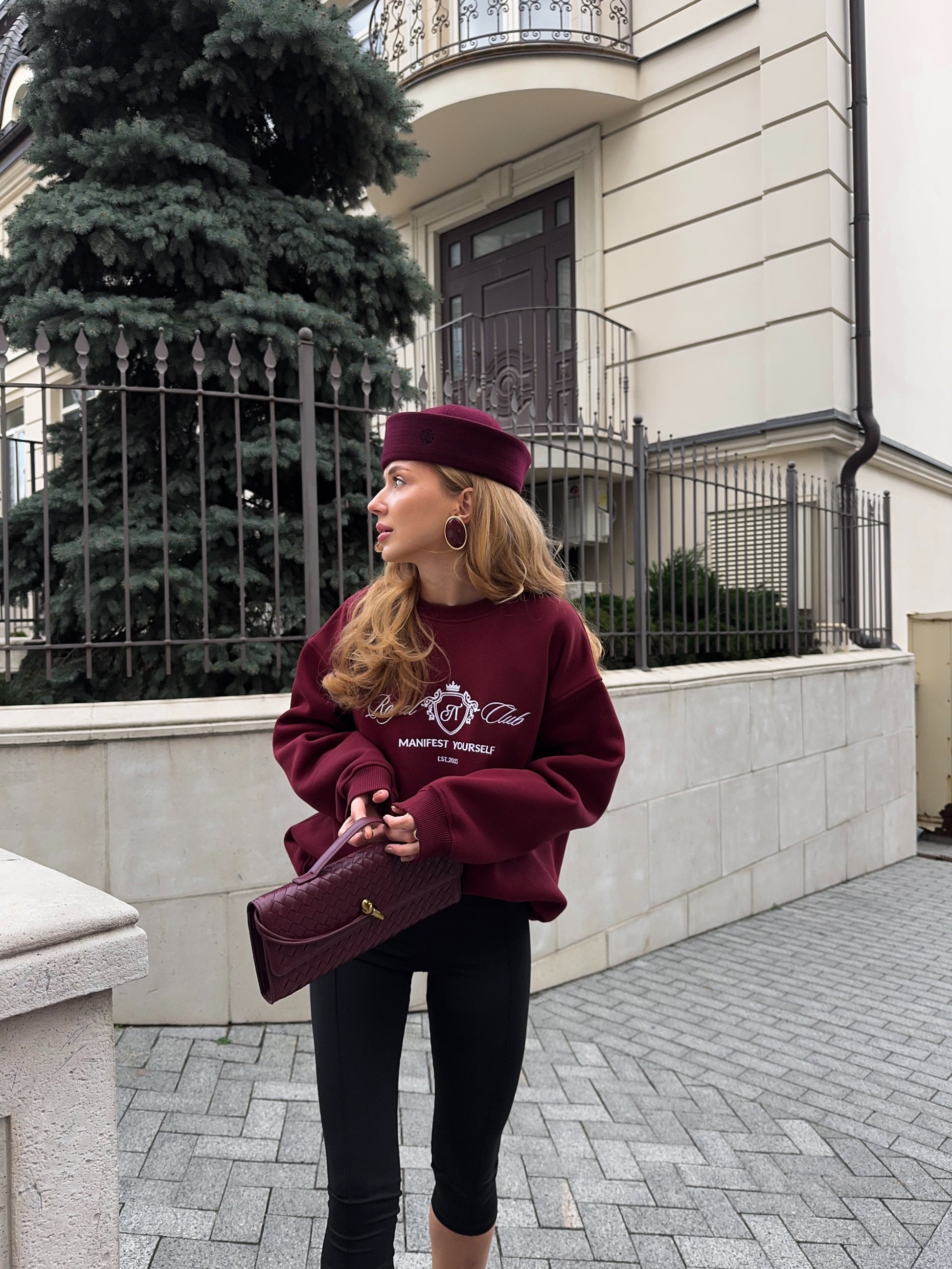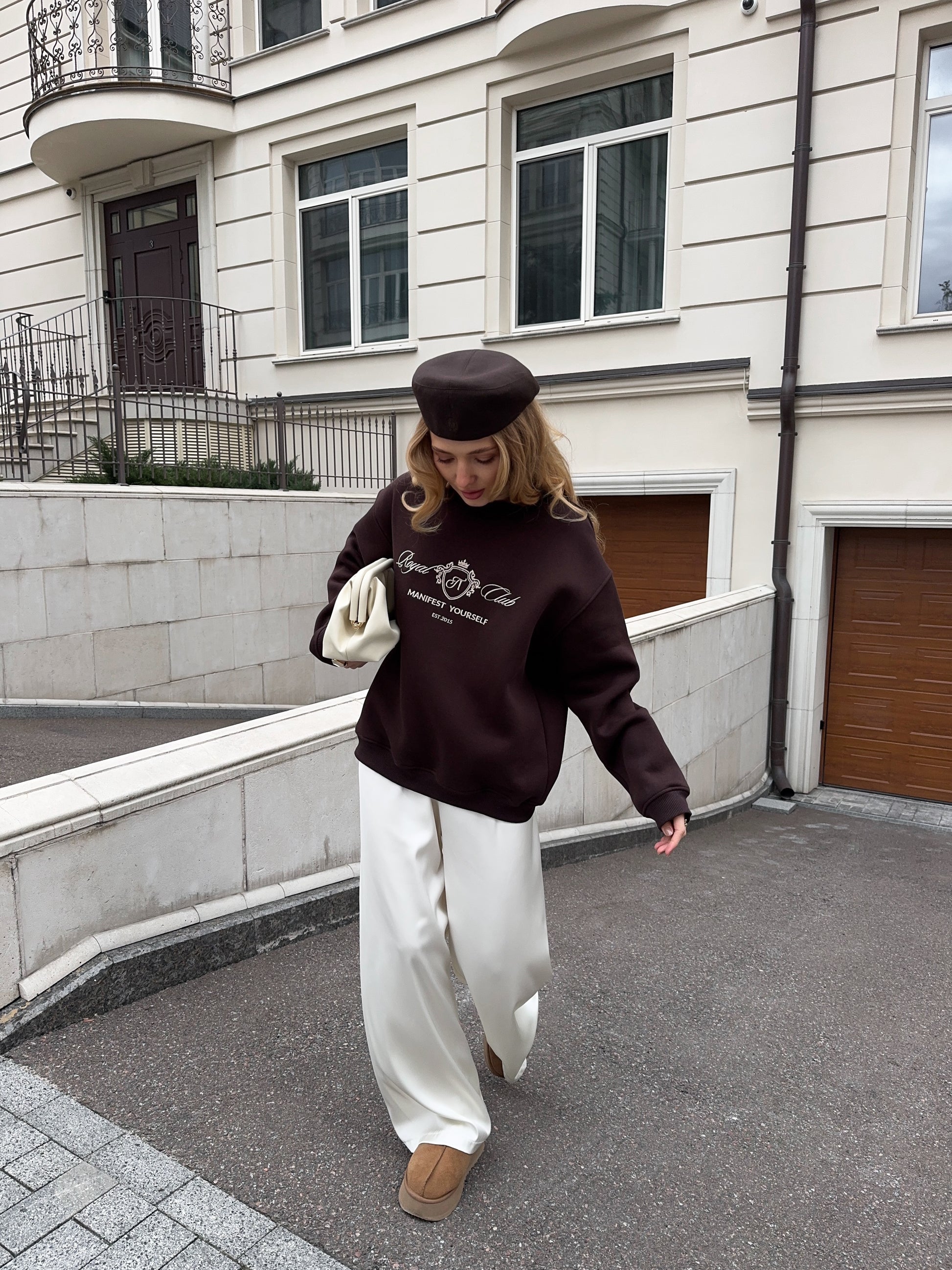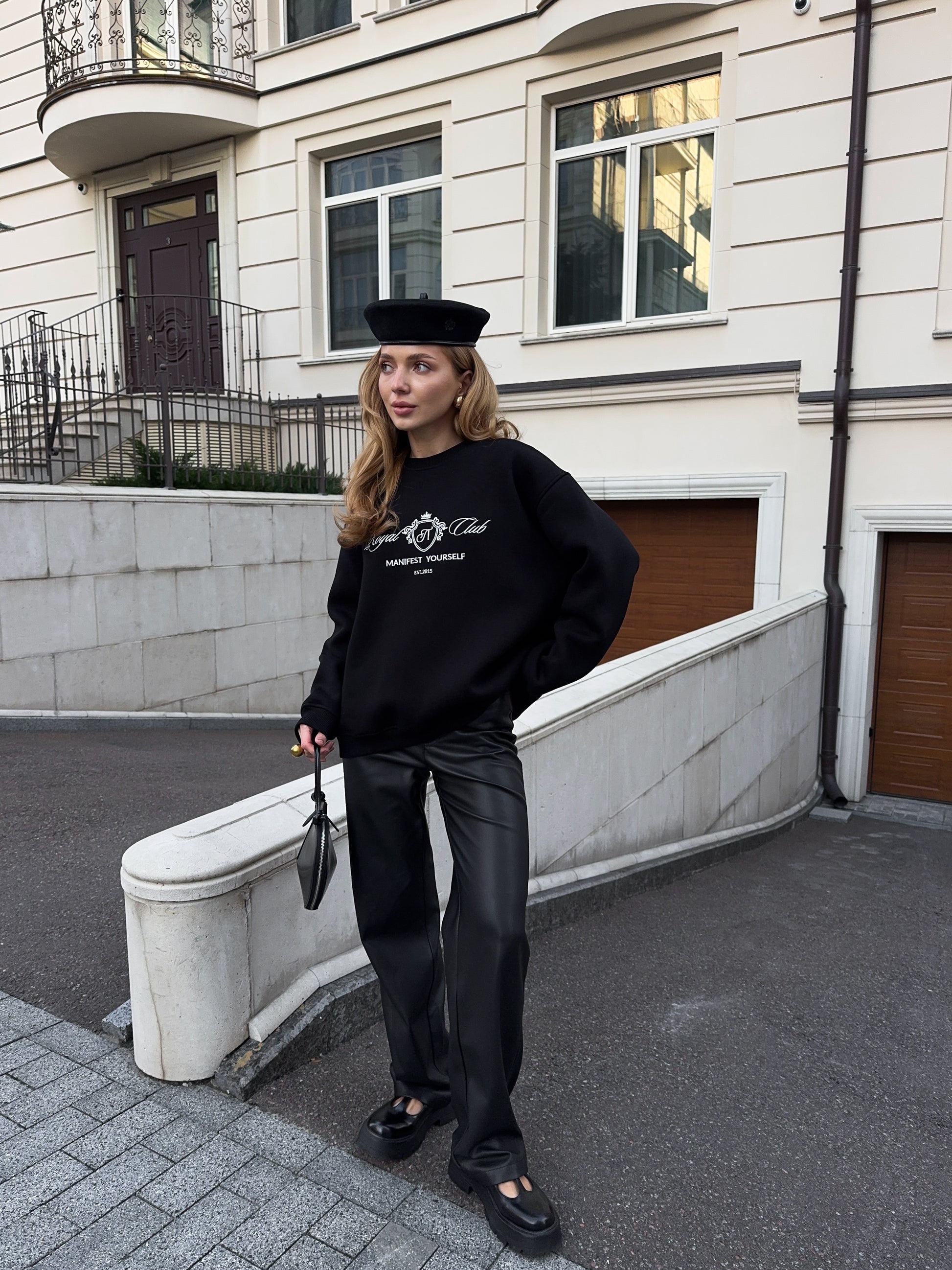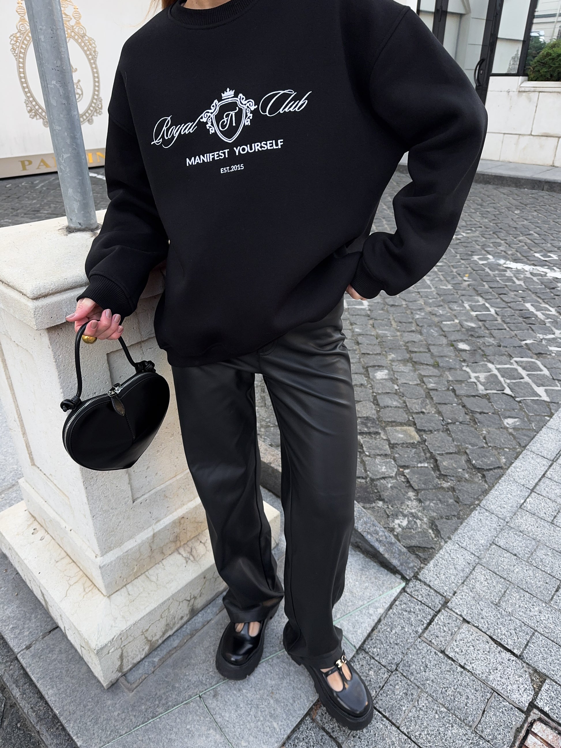 Стильний oversize світшот із обʼємною вишивкою Royal Club – Manifest Yourself створений для комфорту та елегантності у повсякденному стилі.