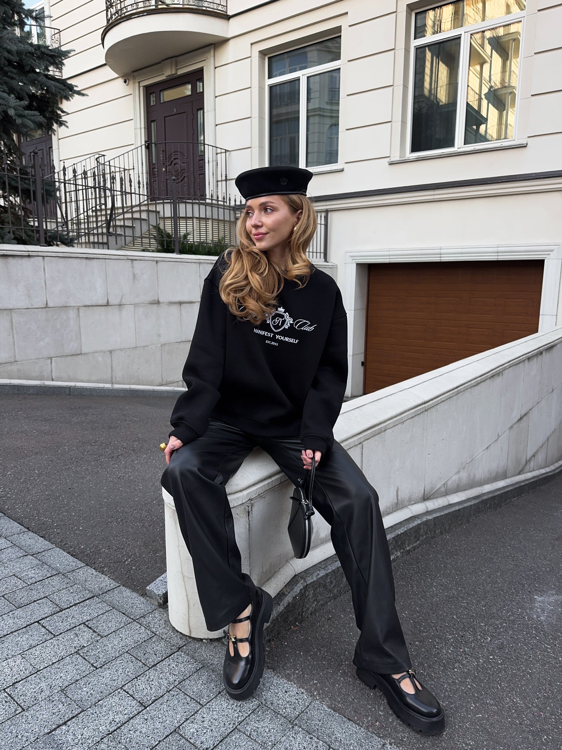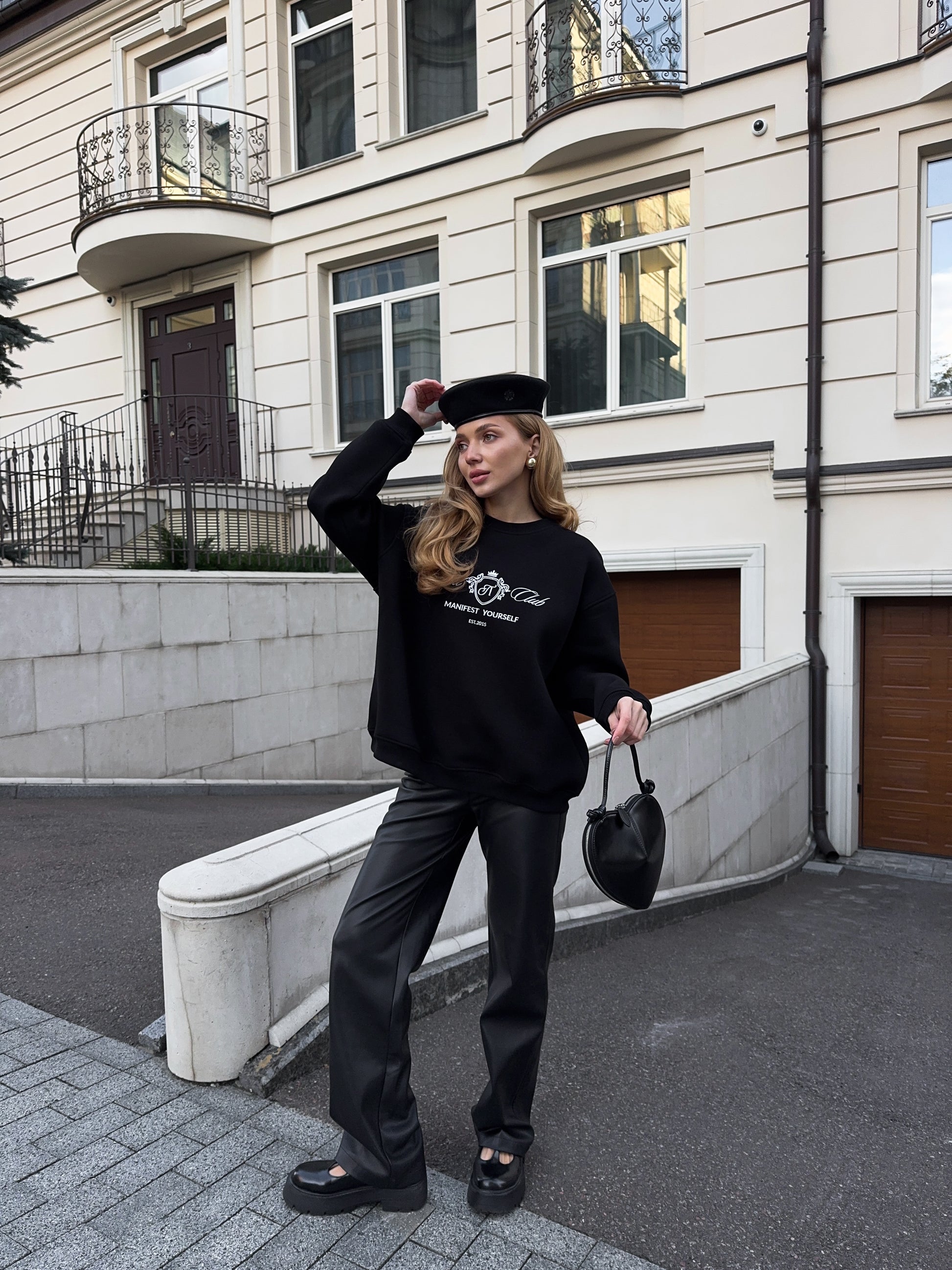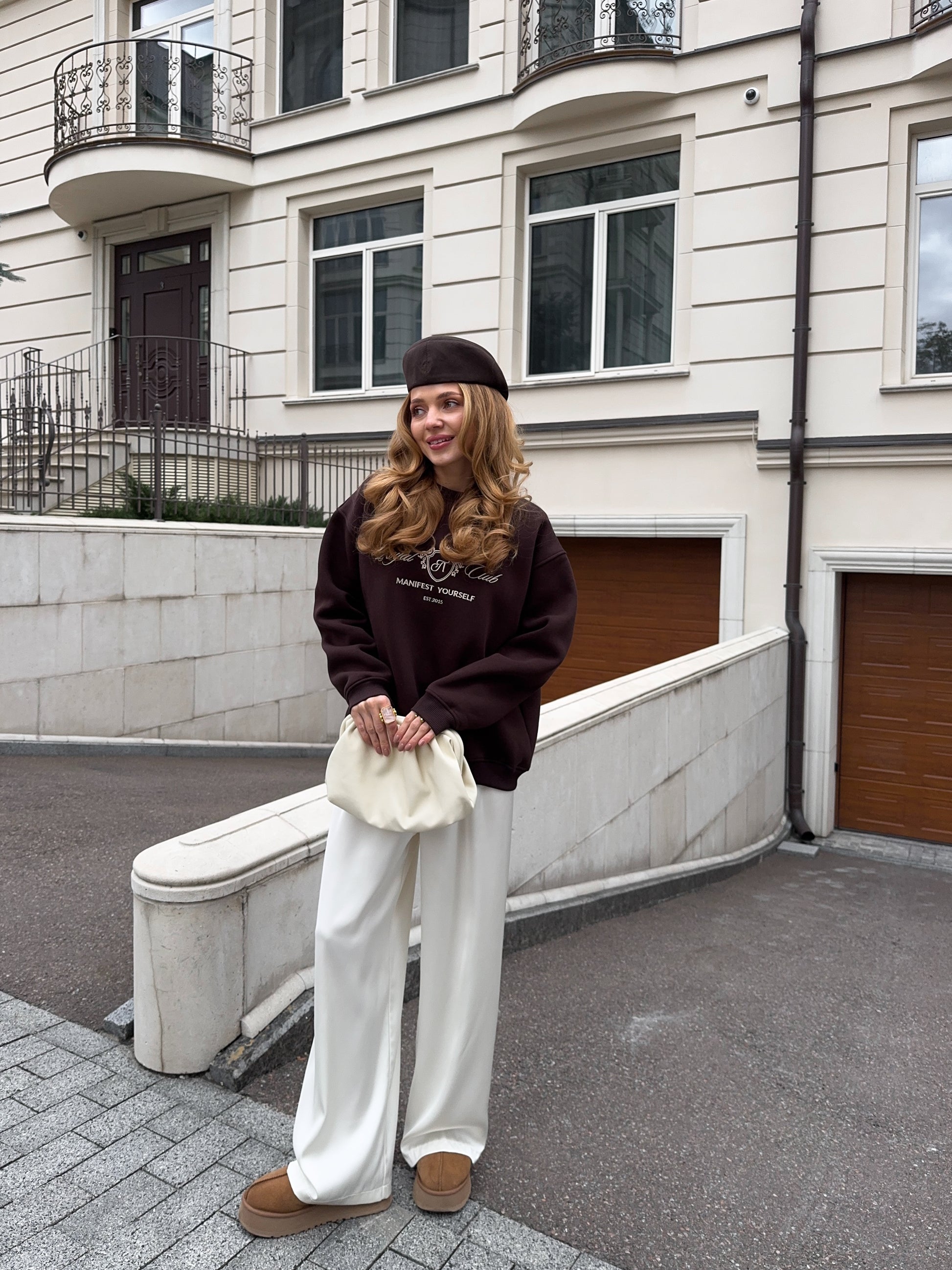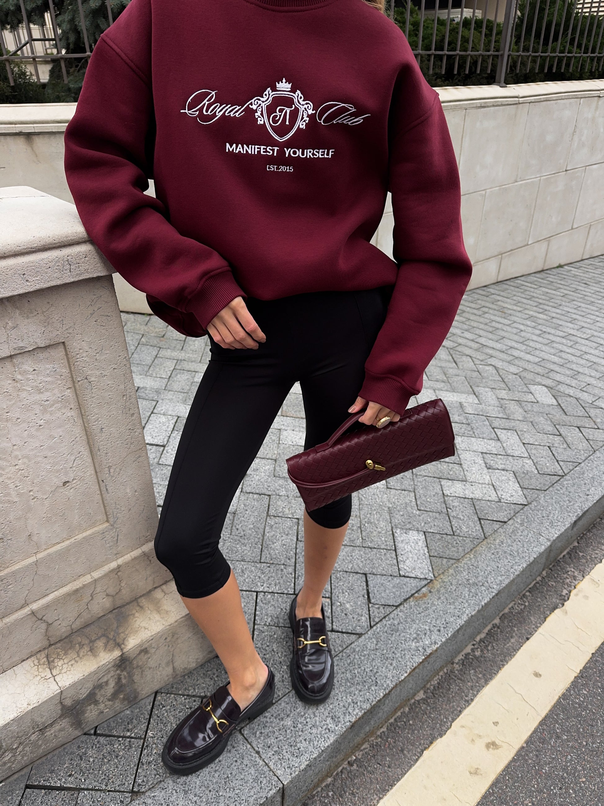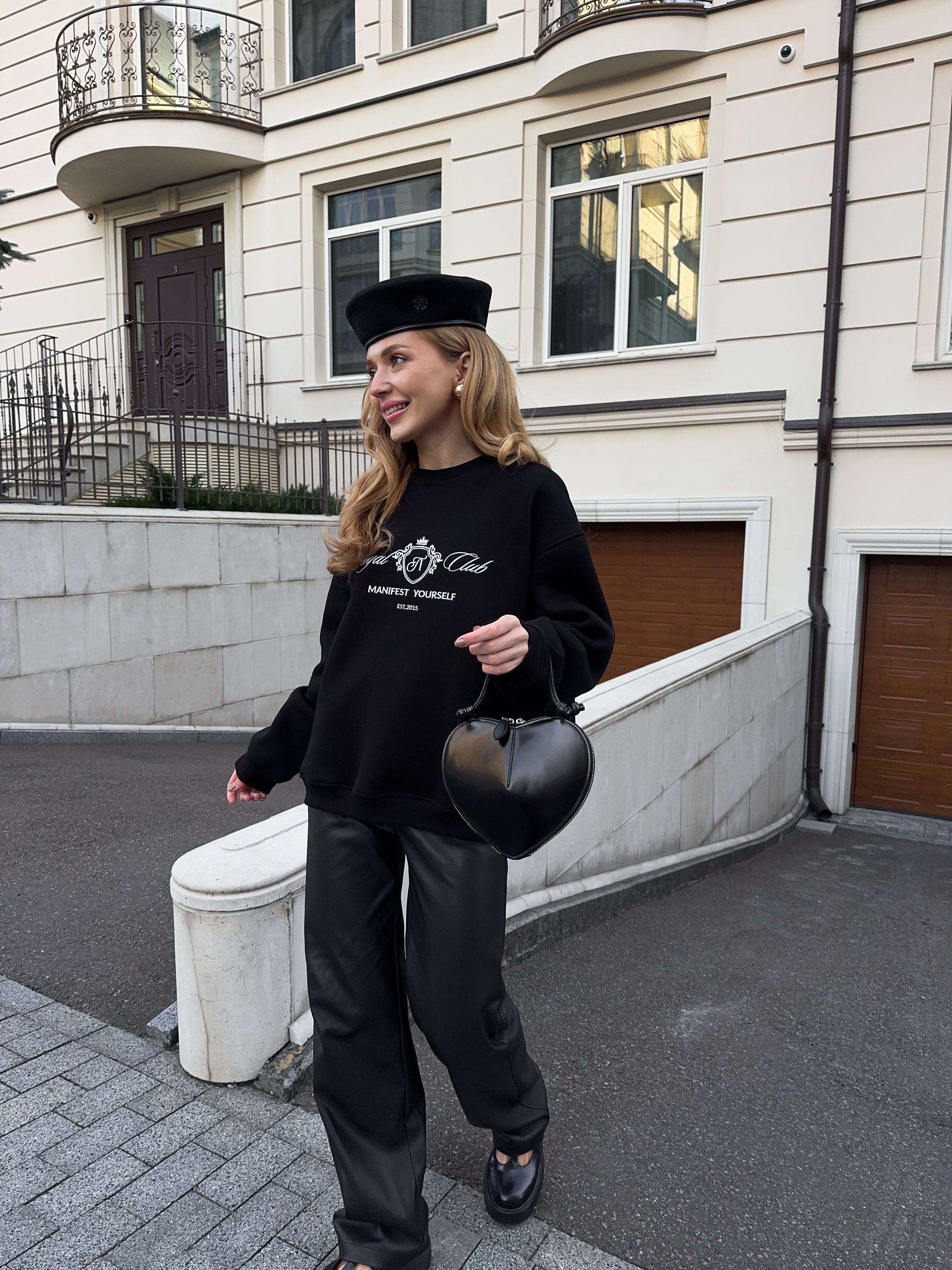 Стильний oversize світшот із обʼємною вишивкою Royal Club – Manifest Yourself створений для комфорту та елегантності у повсякденному стилі.
