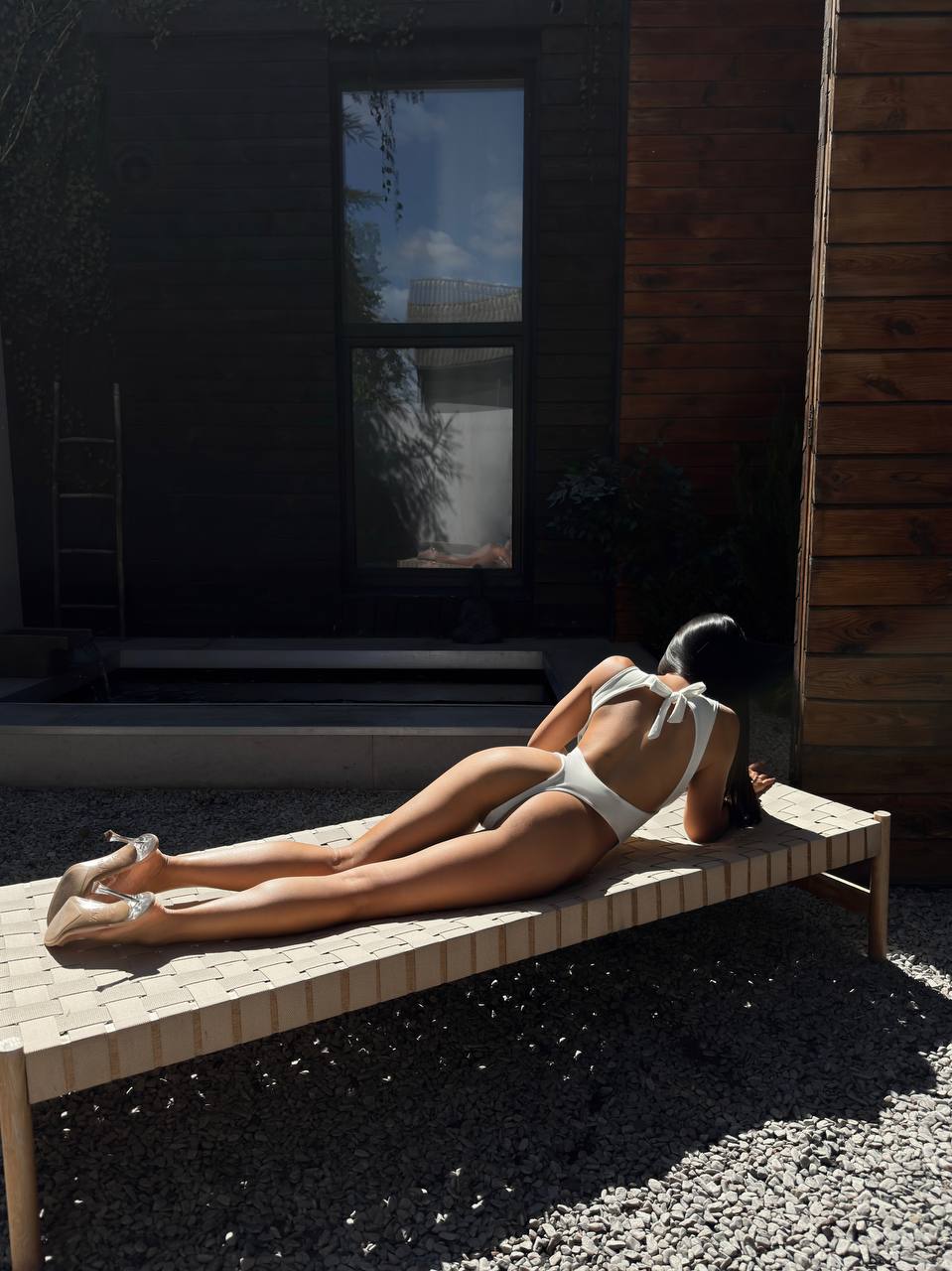Основна тканина — подвійний біфлекс, що поєднує еластичність, м’якість і високу щільність. Завдяки подвійному шару купальник не просвічується навіть у вологому стані, чудово тримає форму й делікатно підкреслює силует.